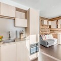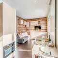 Located on the 5th floor of a six-story residence with elevators, this 35m² premium apartment has been thoughtfully designed to maximize comfort and style. The living room features a cozy sofa bed for two, a flat-screen TV, and two large south-facing windows that flood the space with natural light and showcase the stunning alpine scenery. The fully equipped open-plan kitchen includes a dishwasher, oven, microwave, ceramic hob, and refrigerator, making it easy to prepare meals after a day of exploration. A separate bedroom with two single beds ensures restful nights, while the modern bathroom with a walk-in shower and washing machine adds extra convenience.