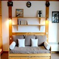 Inside, the 28m² studio is thoughtfully designed to accommodate up to four guests. The living room features a cozy trundle bed for two, while the entrance alcove is equipped with a bunk bed, perfect for families or small groups. The kitchenette is compact yet fully equipped, boasting an electric hob, microwave/grill combo, and dishwasher, making it easy to prepare hearty meals after a day on the slopes. A modern bathroom and separate toilet add to the convenience, while the ski locker on the ground floor ensures your gear is always ready for action.