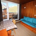 This well-maintained 31m² studio cabin is thoughtfully designed to accommodate up to four guests. The living area features a cozy dining space and a trundle bed for two, while the cabin bedroom offers a snug bunk bed setup, ideal for children or friends. The fully equipped kitchen includes an electric hob, oven, refrigerator, and dishwasher, ensuring you have everything needed to prepare hearty meals after a day on the slopes. Modern amenities like a TV and a ski locker on the ground floor add to the convenience, while the apartment’s pet-friendly policy ensures no family member is left behind.