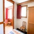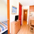 Inside, the apartment is thoughtfully designed to accommodate up to six guests. The cozy living room features a trundle bed and a TV for relaxed evenings, while the fully equipped kitchen with ceramic hob, microwave, and dishwasher makes meal preparation a breeze. A double bedroom and a nook with bunk beds provide comfortable sleeping arrangements for all. The south-facing balcony is perfect for soaking in the sun or enjoying a quiet moment with panoramic views. Additional amenities include a ski locker on the ground floor, elevator access, and the option to bring pets for a small fee.