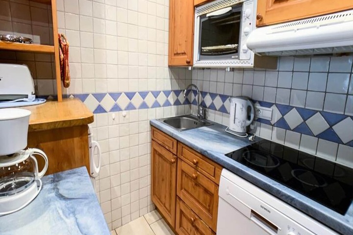 Spanning a generous 63m², this south-facing apartment is designed to accommodate up to nine guests, making it perfect for families or groups of friends. The living room features a cozy trundle bed and a television, creating a warm space to unwind after a day on the slopes. The fully equipped kitchen, complete with a grill oven, ceramic hob, and dishwasher, allows you to prepare hearty meals with ease. The sleeping arrangements include a double bedroom with an en-suite shower, a sleeping alcove with a bunk bed, and a second bedroom with a mix of bunk and trundle beds, ensuring everyone has a comfortable place to rest. A private balcony offers stunning views of the surrounding peaks, while the ski locker on the ground floor adds an extra layer of convenience.