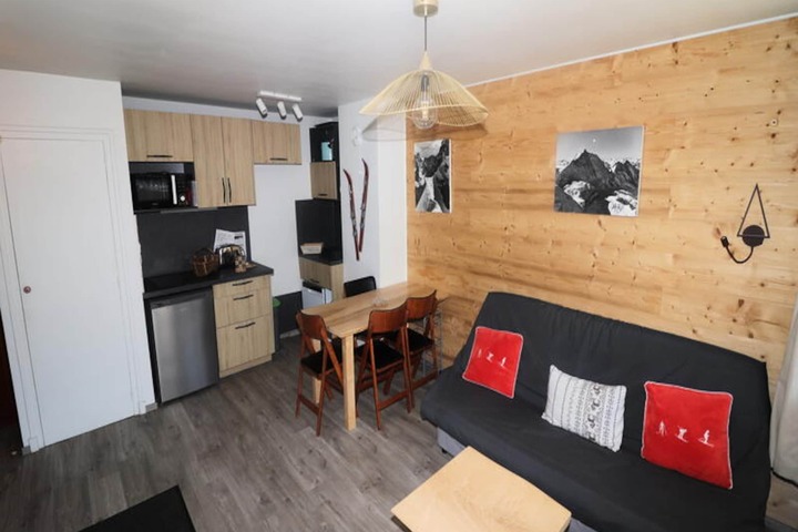 This cozy 33m² apartment, located on the 4th floor of the Grande Balme II residence, is thoughtfully designed to accommodate up to four guests. The living room features a comfortable sofa bed and a television, while the separate bedroom offers a plush double bed for restful nights. The fully equipped kitchen, complete with electric hobs, a microwave, dishwasher, and washing machine, ensures you have all the conveniences of home. Modern amenities like free WiFi and a ski locker add to the ease of your stay.