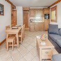 The apartment features an open-plan kitchen equipped with everything you need to prepare meals, including a stove, microwave, and refrigerator. The living area includes a dining space and a TV, perfect for relaxing after a day on the slopes. Guests can also unwind on the sunny south-facing balcony. Additional amenities include access to a swimming pool, gym, and a spa (during winter season), with the option of booking massages for extra relaxation.