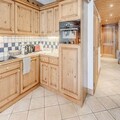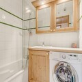 The apartment features a fully equipped kitchen with a refrigerator, oven, stove, and dishwasher, making meal preparation simple. It also includes a bathroom with a bathtub, a washing machine, and a separate toilet. The south-facing terrace offers a peaceful spot to relax and take in the views of the Vanoise Massif.