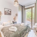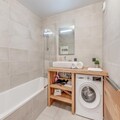 The 72 m² first-floor apartment features a 24 m² south-facing balcony with furnished, unobstructed views. Inside, the fully equipped kitchen includes an oven, microwave, induction hob, refrigerator, and dishwasher. A cozy living space with a sofa, TV, dining area, and a washing machine ensures a comfortable stay.