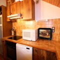 The well-equipped kitchenette includes everything needed for convenient meal preparation, such as a dishwasher, microwave, oven, and a small freezer. The dining area features a table with seating for all, while the living room invites relaxation with plush sofas and a television. Additional amenities include a washing machine, ski lockers, and optional Wi-Fi. This delightful apartment promises a memorable stay with all the comforts of home.