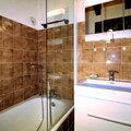 The well-equipped kitchenette includes a dishwasher, oven, electric hob, fridge, and full crockery, allowing guests to prepare their own meals. The bathroom features a bathtub, and there's a separate toilet and washing machine. Additional services, including Wi-Fi, cleaning, and bed linen, are available at an extra cost.