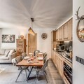 The apartment includes a fully equipped kitchen with induction hob, microwave, dishwasher, and specialty appliances like a raclette machine. Additional conveniences include a washer-dryer, heated ski locker, and covered parking. Essential services like Wi-Fi, bed linens, towels, and end-of-stay cleaning (excluding the kitchen) are included. A refundable €1,500 deposit ensures a worry-free stay.