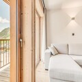 The apartment is fully equipped for your comfort, with a modern kitchen featuring an oven, microwave, induction hob, refrigerator, freezer, and dishwasher. Additional amenities include free WiFi, covered parking with bike storage, and electric vehicle charging options. The spacious dining area with a large wooden table and leather chairs makes it perfect for family meals or gatherings after a day of exploring the mountains. End-of-stay cleaning (excluding the kitchen) is included for a seamless experience.