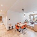 This spacious 90m² apartment accommodates up to 8 people, featuring three bedrooms, including a master with an en-suite shower room and two bedrooms with single beds. The cozy living area offers a double sofa bed, armchairs, a TV, and a pellet stove, creating a warm, inviting atmosphere. The apartment has a balcony with a south/east-facing view, allowing plenty of natural light. Pets are not allowed, and smoking is prohibited. A security deposit is required.