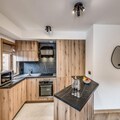 The apartment features a fully equipped kitchen with an oven, microwave, induction hob, fridge, and dishwasher, allowing guests to prepare meals at their leisure. The bathroom includes a shower, and there is a separate toilet with a washing machine and dryer for added convenience. Guests also have access to covered parking, a ski locker, and a bike rack, with an electrical charging socket available for e-bikes. An indoor swimming pool and sauna will be available in December 2023 for added relaxation after a day of outdoor activities.