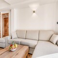 The apartment boasts a fully equipped kitchen with modern appliances, including an oven, microwave, induction hob, refrigerator, and dishwasher. The spacious dining area is perfect for family meals, and the bathroom is equipped with a washer/dryer. Additional amenities include a separate toilet and a private terrace with outdoor furniture for relaxing after a day of adventure.