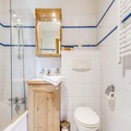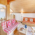 The spacious 4-room duplex apartment accommodates up to eight guests, making it ideal for families or groups. On the ground floor, you'll find a welcoming entrance hall, a suite with a double bed and private shower, and a fully equipped kitchen that opens onto a sunny terrace. The living room features a cozy lounge area with TV and two sofas that double as single beds, complemented by skylight windows and a southwest-facing balcony. Upstairs, two bedrooms with flexible bedding options and private balconies, along with a bathroom, complete the layout. Modern amenities such as Wi-Fi, a private garage, and ski lockers ensure convenience, while the included bed linens and end-of-stay cleaning add a touch of luxury.