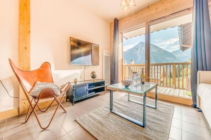 The 2-room apartment, spanning 42m², is thoughtfully designed to accommodate up to four guests. The living room features a comfortable sofa bed, a flat-screen TV, and a large bay window that opens onto a furnished balcony, where you can soak in the sun and admire the panoramic views. The fully equipped kitchen, complete with a Nespresso machine, raclette set, and modern appliances, invites you to prepare delightful meals to enjoy in the dining area. The double bedroom offers a restful haven, while the bathroom is equipped with a shower, towel dryer, and washing machine for added convenience.
