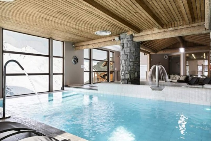 For ultimate relaxation, the residence boasts a 900m² wellness area, including a swimming pool, sauna, hammam, and fitness room. After an active day, indulge in refined Savoyard cuisine at one of the two on-site restaurants, L'Auberge des Balcons or La Cabane, where every meal becomes a celebration of mountain flavors.