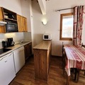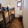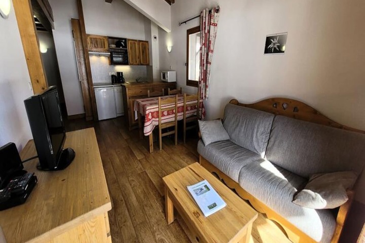 The apartment sleeps up to six guests, with a double bedroom, a smaller room with bunk beds, and a double sofa bed in the living room. Amenities include a fully equipped kitchen with modern appliances, a cozy lounge with a flat-screen TV, and Wi-Fi access. The bathroom features a bathtub and sink, with a separate WC. Ski lockers are conveniently located at the entrance, while underground parking is available for an additional fee. Please note that pets are not allowed, and the property is not accessible to those with reduced mobility.