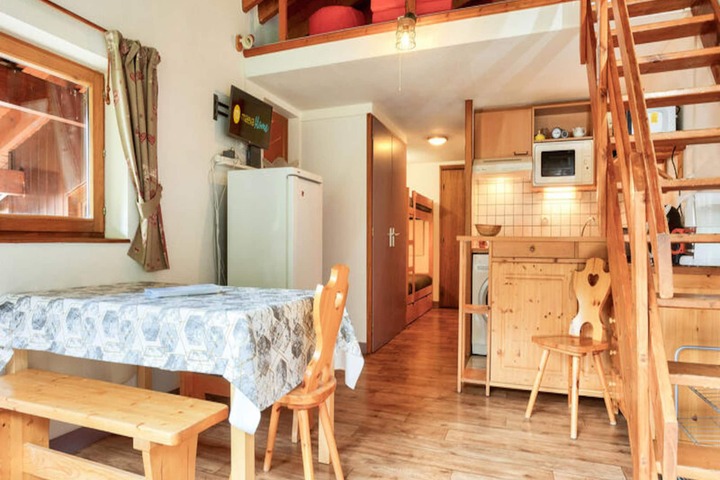 This cozy 2-room mezzanine apartment comfortably accommodates up to six guests, making it ideal for families or small groups. The thoughtfully designed interior features a bedroom with a double bed, a mezzanine with a double sofa bed, and bunk beds in the entrance hall. The living area includes a fully equipped kitchen with modern appliances such as an oven, microwave, refrigerator, dishwasher, and washer/dryer, ensuring all the comforts of home. After a day of adventure, unwind in the inviting lounge area with a television and free Wi-Fi, or relax in the bathroom with a bathtub and heated towel rail.