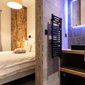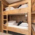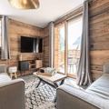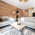 Spread across two levels, this beautifully designed apartment combines modern comfort with warm, traditional decor. The upper floor boasts a spacious living area bathed in natural light, thanks to large west-facing windows that open onto a 13m² balcony overlooking the slopes and surrounding nature. The fully equipped kitchen, complete with a dishwasher, induction hob, oven, and microwave, invites you to prepare hearty meals after a day on the mountain. A cozy sleeping alcove with bunk beds, a bathroom, and a separate toilet complete this level. On the ground floor, two elegant master suites, each with its own bathroom, provide restful privacy, making this apartment perfect for two families or groups of up to eight friends.