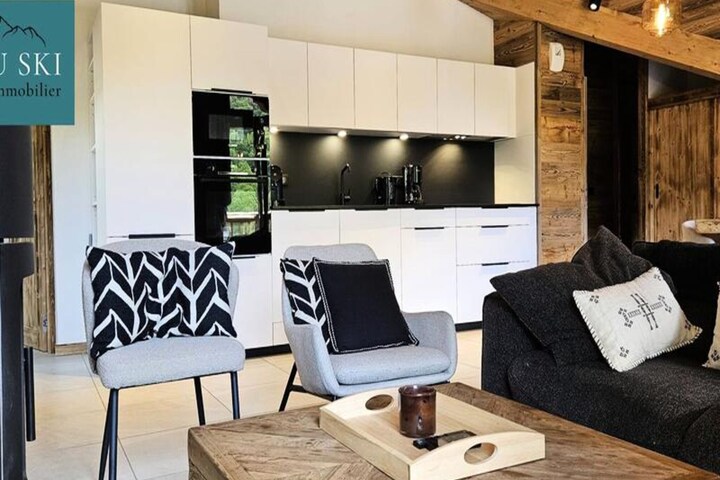 Inside, the apartment boasts a modern, fully equipped kitchen, including a dishwasher, large fridge, oven, coffee maker, and all necessary crockery. The 40 m² living area features a dining table for 11, along with a comfortable seating area and TV. The apartment also has a shared bathroom, separate toilets, and a south-facing balcony with a scenic view of the slopes. Additional amenities include a ski locker with boot dryer, free WiFi, and two covered parking spaces with electric car charging.