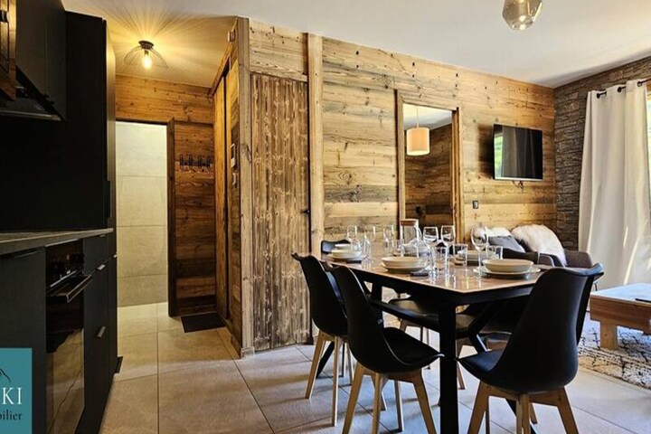 The modern kitchen is fully equipped with a dishwasher, large fridge, oven, coffee maker, kettle, and toaster, providing everything needed for cooking meals. The apartment also features a shower room with WC, and the living room is equipped with a TV. Additional amenities include a ski locker with a boot dryer and a covered parking space. Sheets, towels, and Wi-Fi are available for an extra charge.