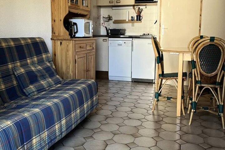 The studio is thoughtfully designed to maximize comfort and convenience. The mountain-style entrance leads to two single bunk beds, perfect for children or friends, while the living room features a double sofa bed for restful nights. The kitchenette is equipped with modern appliances, including a dishwasher, washer/dryer, oven, microwave, and Nespresso coffee machine, making meal preparation effortless. A bathroom, separate toilet, and ski locker ensure practicality, while the outdoor parking space adds to the ease of your stay. Pets are not allowed, ensuring a clean and tranquil environment for all guests.