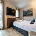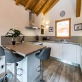 Spread across three floors, Chalet Dente combines traditional alpine charm with contemporary amenities. The top floor features a spacious and bright living area under the eaves, complete with a cozy TV lounge, a dining space, and a fully equipped kitchen. Step out onto the south-facing furnished balcony to soak in the crisp mountain air and panoramic views. The first floor houses two inviting bedrooms, one with a double bed and the other with two single beds, both equipped with ample storage. A shared bathroom with a toilet completes this level. On the ground floor, the luxurious master bedroom spans the entire width of the chalet, boasting a king-size bed, a flat-screen TV, and a desk/vanity area. This floor also includes a large bathroom, a laundry room, and a spacious entrance hall leading to a ski room with boot dryers.