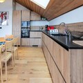 The open-plan living-dining area features a fully equipped kitchen, perfect for preparing meals. A large bay window opens to the terrace, offering stunning mountain views. The apartment has three bathrooms, including two with showers and one with a bathtub. The fully equipped kitchen ensures guests can cook with ease, while additional services such as ski pass delivery, ski equipment rental discounts, and catering can be arranged for a seamless stay.