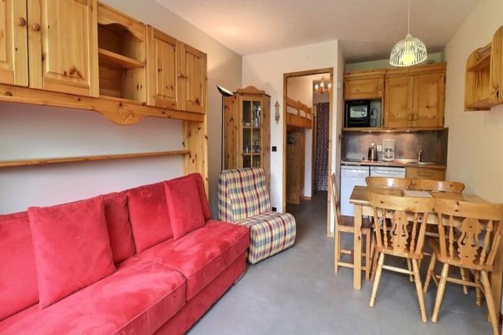 High above the Tarentaise Valley, where the crisp alpine air invigorates the senses, the Asphodèles residence offers a cozy retreat for ski enthusiasts and nature lovers alike. Positioned just 200 meters from the slopes, this charming property is perfectly situated between the vibrant shopping hubs of Le Hameau and the town center, ensuring both convenience and tranquility for your mountain escape. Whether you're here for thrilling winter sports or serene summer hikes, this residence places you at the heart of the action. \n\nInside, the apartment is thoughtfully designed to accommodate up to four guests. The living room features a comfortable double sofa bed, while the separate sleeping area offers a snug double bed with a window that lets in natural light. The kitchenette is equipped with modern amenities, including a mini-oven, refrigerator, dishwasher, and induction hob, making it easy to prepare meals after a day of adventure. The south-east facing balcony provides a delightful spot to enjoy your morning coffee or unwind as the sun sets over the peaks. With a flat-screen TV and individual water heater for added comfort, this space is ideal for relaxation. \n\nThe residence is conveniently connected to the slopes via the Perdrix green run, leading to the main ski lift departure point. For easy access to shops and restaurants, the Chalets cable car is just 150 meters away and operates free of charge from early morning until late evening. In summer, the area transforms into a haven for hikers and cyclists, with trails that weave through breathtaking landscapes. \n\nWhether you're seeking adrenaline-filled days on the slopes or peaceful moments surrounded by alpine beauty, the Asphodèles residence promises an unforgettable stay in the heart of the French Alps.