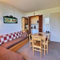 Designed for up to four guests, the apartment features a smart layout with a living room that includes a sofa bed and trundle beds, as well as a separate bedroom with two single beds, divided by a sliding door for added privacy. The kitchenette is equipped with everything you need to prepare hearty meals after a day on the slopes, including an oven, refrigerator, dishwasher, and small appliances like a kettle and toaster. Modern comforts such as a flat-screen TV and free Wi-Fi ensure a pleasant stay, while the warm, inviting decor creates a homely atmosphere.