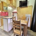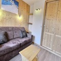 The studio, rated 3 stars and designed for up to four guests, offers a cozy and functional layout. The living area features a set of trundle beds, while a sliding wall separates a sleeping area with a comfortable double sofa bed. The kitchenette is fully equipped with modern appliances, including a combination microwave, ceramic hobs, a dishwasher, and more, making it easy to prepare delicious meals after a day on the slopes. The flat-screen TV and thoughtful amenities ensure a comfortable stay, while the east-facing orientation fills the space with natural light.