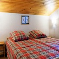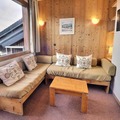 Designed to accommodate up to eight guests, this 43m² duplex apartment combines practicality with comfort. The living room features two single sofa beds, while the dining area offers a cozy space for shared meals. The kitchenette is equipped with modern appliances, including a combination microwave oven, refrigerator, and dishwasher, ensuring you have everything needed for a hassle-free stay. Upstairs, the mezzanine hosts three bunk beds, complemented by a cabin bedroom loft with a double bed and an additional bedroom with two single beds. Two bathrooms, one with a shower, provide convenience for larger groups, and the north-facing balcony invites you to unwind with views of the alpine surroundings.