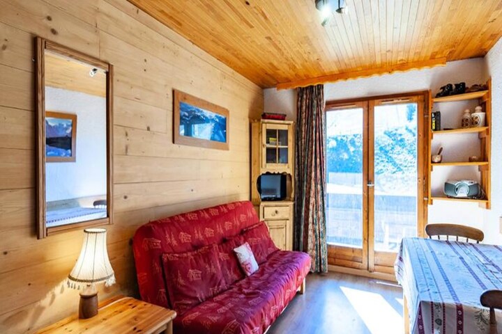 Inside, the apartment is thoughtfully designed for comfort and practicality. The living room features a cozy sofa bed and a television, opening onto a balcony where you can savor the crisp mountain air. The bedroom boasts a plush double bed for restful nights, while the kitchenette is fully equipped with modern appliances including a ceramic hob, dishwasher, combi oven, refrigerator, coffee maker, and kettle. A separate bathroom and toilet ensure convenience, and additional amenities such as a ski locker and elevator make your stay effortless. The apartment is non-smoking and pet-free, ensuring a clean and peaceful environment.