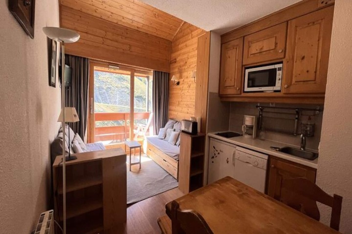High above the picturesque valley of Méribel Mottaret, this charming alpine apartment offers a cozy retreat for families and groups seeking a memorable mountain escape. With its prime location on the 11th floor of the Le Pralin residence, you’ll enjoy breathtaking views and direct access to the slopes, making it an ideal choice for ski enthusiasts and nature lovers alike. The serene ambiance of this modern residential area provides the perfect balance of tranquility and convenience. \n\nThe apartment comfortably accommodates up to six guests, featuring a living room with two sofa beds, a trundle bed, and a west-facing balcony where you can unwind after a day of adventure. The cabin bedroom with bunk beds and a master bedroom with a double bed and en-suite bathroom ensure restful nights for everyone. The fully equipped kitchenette includes a ceramic hob, combi oven, dishwasher, and more, allowing you to prepare hearty meals with ease. Additional amenities such as a ski locker, elevator, and optional services like linens and end-of-stay cleaning ensure a hassle-free stay. \n\nLe Pralin residence is perfectly situated at the foot of the slopes, directly across from the kindergarten and just steps from the Châtelet shopping center. The resort center, with its vibrant shops and dining options, is only 300 meters away, offering everything you need within easy reach. In summer, the area transforms into a haven for hikers and outdoor enthusiasts, with trails and breathtaking vistas waiting to be explored. \n\nWhether you’re here to carve through pristine snow or soak in the alpine beauty, this apartment provides the ultimate base for creating unforgettable memories in the heart of the French Alps.