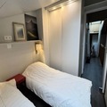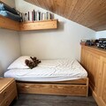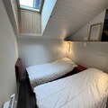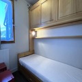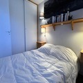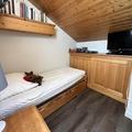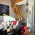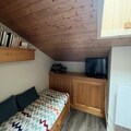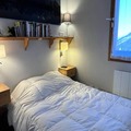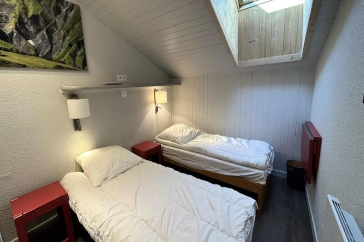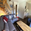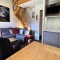 Inside, the apartment is thoughtfully designed to accommodate up to eight guests across two levels. The entrance level features a cozy living room with a corner sofa, a well-equipped kitchenette for preparing hearty meals, and two comfortable bedrooms. Upstairs, you’ll find additional sleeping arrangements, including a mezzanine relaxation area with a TV for unwinding after an active day. Modern amenities such as a dishwasher, oven, and private ski locker ensure a seamless and comfortable stay. The apartment also includes a private garage, conveniently located opposite the residence entrance.