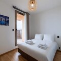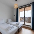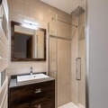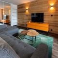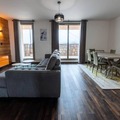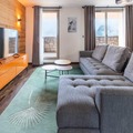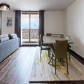 The apartment boasts a generous living space featuring a large dining table and a cozy sofa bed, perfect for unwinding after a day on the slopes. The fully equipped kitchen includes everything you need for a home-cooked meal, from a large refrigerator to a Nespresso coffee machine. Two well-appointed bedrooms offer flexible sleeping arrangements: one with a king-size bed and another with two single beds. The two bathrooms cater to all needs, with one featuring a shower and the other a spacious bathtub, accessible for those with reduced mobility. Additional conveniences include a separate toilet and a washing machine for longer stays.