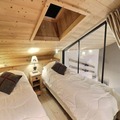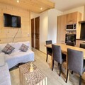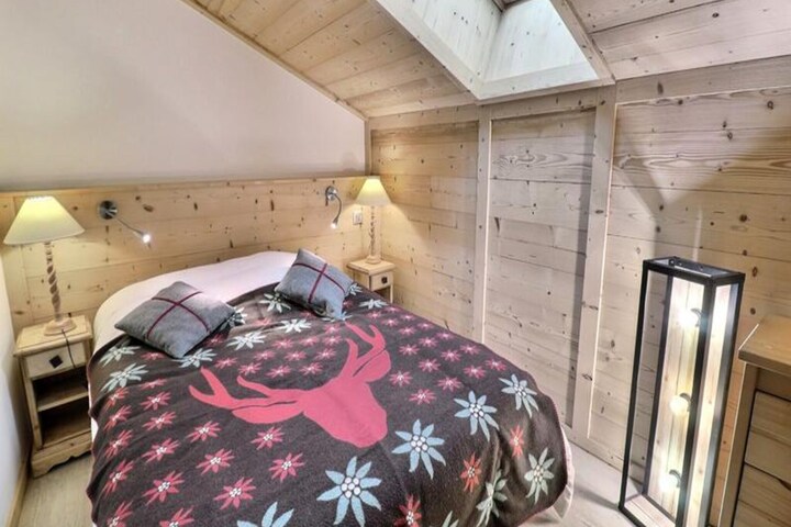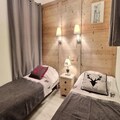 Designed for comfort and convenience, this 4-room duplex accommodates up to six guests. The living area features two cozy sofas, one of which converts into a bed, creating a warm and inviting space to unwind after a day on the slopes. The open-plan kitchen is fully equipped with modern appliances, including a Nespresso machine and dishwasher, making meal preparation a breeze. The bedrooms are thoughtfully arranged, with two single beds on the main floor and two additional bedrooms upstairs, one with a double bed and the other with twin beds under skylights, perfect for a restful night’s sleep.