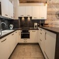 Inside, the apartment boasts a fully renovated interior with elegant finishes and thoughtful design. The open-plan kitchen, equipped with top-of-the-line appliances, flows seamlessly into a spacious living area with soaring ceilings and a large bay window that floods the space with natural light. A second living room, which can be converted into a bedroom with a plush 160cm sofa bed, offers additional comfort and flexibility. The master bedroom, featuring a luxurious 160cm bed, opens onto a south-facing terrace where you can soak in panoramic mountain views. Additional sleeping arrangements include a cozy bunk room and a mezzanine bedroom with its own en-suite bathroom, complete with a whirlpool tub. A second bathroom with a shower and separate toilet ensures convenience for all guests.