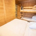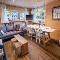 The apartment boasts a warm and inviting living space, complete with a cozy sofa, a large dining table for shared meals, and an open-plan kitchen equipped with everything you need, including a Nespresso machine, toaster, and dishwasher. With two bedrooms, one featuring a double bed and bunk beds, and another with bunk beds, it comfortably accommodates families or groups of up to six. The bathroom is thoughtfully designed with a bathtub, dual sinks, and a toilet, ensuring convenience and relaxation after a day in the mountains. Wi-Fi is included to keep you connected during your stay.