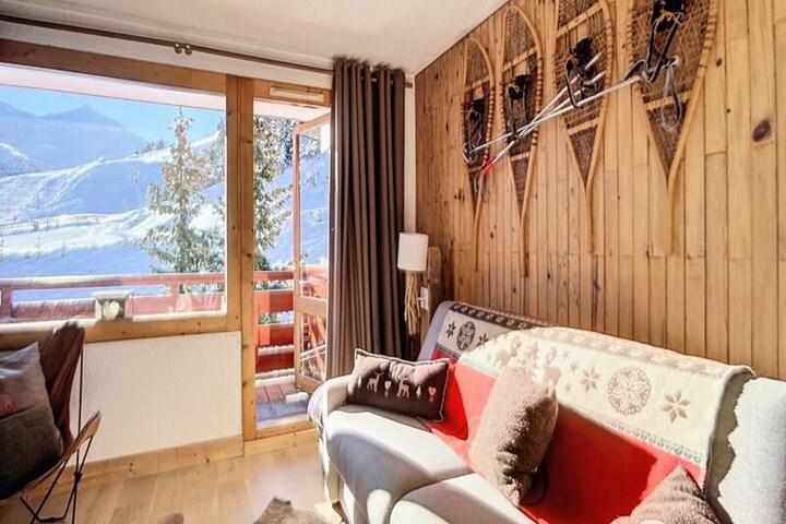 Recently renovated, this 34 m² apartment combines modern comfort with alpine charm. The living room invites relaxation with a sofa bed featuring a high-quality mattress, while the dining area is perfect for shared meals after a day on the slopes. The well-equipped kitchen boasts a ceramic hob, oven, microwave, dishwasher, and Nespresso machine, making it easy to prepare hearty dishes. A bedroom with twin beds and a single bunk bed ensures restful nights, complemented by a bathroom with a shower and washer/dryer, and a separate WC for added convenience. Wi-Fi, linens, and end-of-stay cleaning are all included, making your stay stress-free.