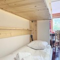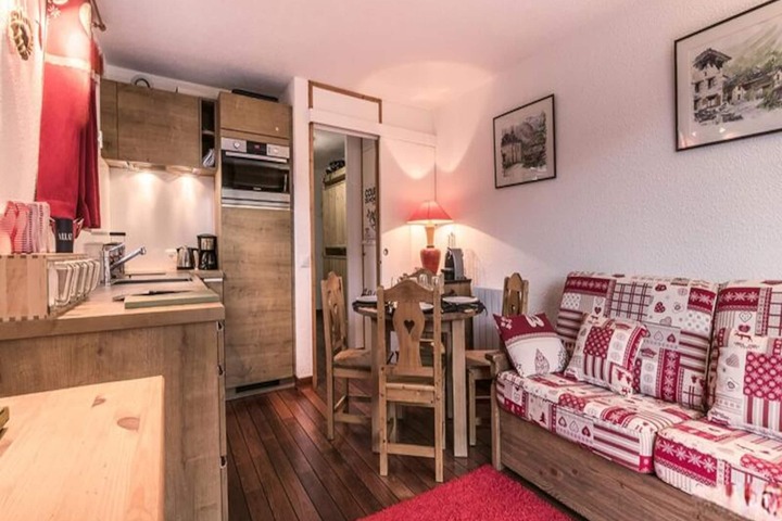 Recently renovated, the 30 m² apartment maximizes space with modern touches while retaining its cozy alpine charm. The open-plan living room features a well-equipped kitchen with a ceramic hob, oven/microwave, dishwasher, and Nespresso coffee machine. Enjoy meals at the dining table or relax on the sofa bed while gazing out at the snowy peaks from the balcony. The apartment accommodates up to four guests with a double bedroom and a sleeping alcove with bunk beds, ensuring comfort for families or small groups. A massage shower in the bathroom adds a touch of luxury, while Wi-Fi and a private ski locker enhance your stay.
