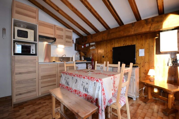 The apartment’s warm interior features exposed beams that exude rustic charm. The living room, equipped with a flat-screen TV and an open-plan kitchen, is perfect for gathering after a day of skiing. The kitchen is fully equipped with modern amenities, including ceramic hobs, a mini oven, a refrigerator, a microwave, and a dishwasher. The sleeping arrangements are thoughtfully designed, with a cozy double bedroom, an alcove with bunk beds, and a living room with a sofa bed and pull-out bed, ensuring comfort for all guests. Additional conveniences include a ski locker, private outdoor parking, and Wi-Fi with Orange TV. Pets are welcome, making it a perfect choice for families.