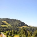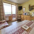 The studio is thoughtfully designed to maximize comfort and functionality. The living room, bathed in natural light, features a flat-screen TV and a double sofa bed, while the cabin bedroom offers snug bunk beds, making it ideal for couples or small families. The open-plan kitchen is fully equipped with electric hobs, a mini-oven, microwave, refrigerator, and dishwasher, ensuring you have everything needed to prepare hearty meals after a day on the slopes. A bathroom with a bathtub and a separate toilet add to the convenience, while the mountain-inspired decor creates a warm and inviting atmosphere.