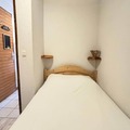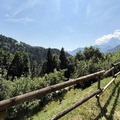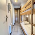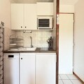 Inside, the apartment is thoughtfully designed to accommodate up to five guests. The living room features a flat-screen TV, while the open-plan kitchen is equipped with modern amenities, including a mini-oven, microwave, dishwasher, and refrigerator. Sleeping arrangements include a cozy bedroom with a double bed, a sleeping alcove with bunk beds, and a sofa bed in the living room, all complemented by warm mountain-style decor. The bathroom includes a bathtub, and there’s a separate toilet for added convenience. Families will appreciate the space in front of the apartment, perfect for children to play in a safe and peaceful environment.