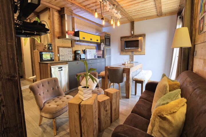 Amid the breathtaking scenery of the French Alps, Chalet La Chèle invites you to experience the perfect blend of modern comfort and alpine charm. Just 100 meters from the Boulangère ski lift, this chalet offers seamless ski-in/ski-out access to the renowned Espace Diamant ski area, boasting 192 kilometers of interconnected slopes across six picturesque village resorts. Whether you're an avid skier or simply seeking a serene mountain escape, this location caters to every desire. In summer, the chalet transforms into a gateway to lush trails and panoramic views of Mont Blanc, with the Mont Rond chairlift providing easy access to unforgettable vistas. \n\nSpanning 78 square meters, the apartment is thoughtfully designed for groups of six to eight guests. Its garden-level layout features a spacious south-west facing terrace, complete with garden furniture, where you can soak in views of Mont Charvin, Mont Bisanne, and the Aravis mountain range. Inside, the chalet boasts a fully equipped open-plan kitchen, a cozy ethanol fireplace, and modern amenities such as a flat-screen TV and PlayStation. The sleeping arrangements include an en-suite double bedroom, two additional double bedrooms, a twin room, and a bunk room, ensuring comfort for all. Two bathrooms, including a double shower, and two separate toilets add convenience to your stay. \n\nLocated in the sunny hamlet of Les Frasses, Notre Dame de Bellecombe, the chalet is ideally positioned for exploring the region. In winter, enjoy easy access to ski slopes and nearby villages like Flumet and Les Saisies. In summer, discover hiking trails, mountain biking routes, and the leisure center at Flumet Lake, just 9 kilometers away. The chalet also offers practical amenities such as a ski locker, parking, and baby equipment upon request. \n\nWith high-quality furnishings, tasteful decor, and exceptional service, Chalet La Chèle promises an unforgettable alpine retreat. Whether you're chasing powdery slopes or tranquil summer trails, this cozy haven is your perfect home away from home.