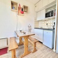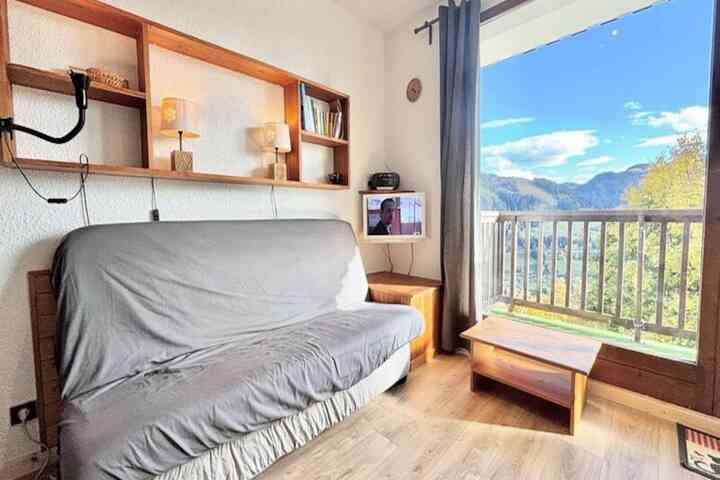 Compact yet thoughtfully designed, the 19 m² studio features an inviting living room with a comfortable sofa bed, a practical kitchenette for preparing hearty meals, and a bathroom with all essentials. The entrance includes two bunk beds, ideal for families or small groups, though the upper bunk is not suitable for children under six. A ski locker ensures your gear is always ready, while the unreserved outdoor parking space adds convenience to your stay.