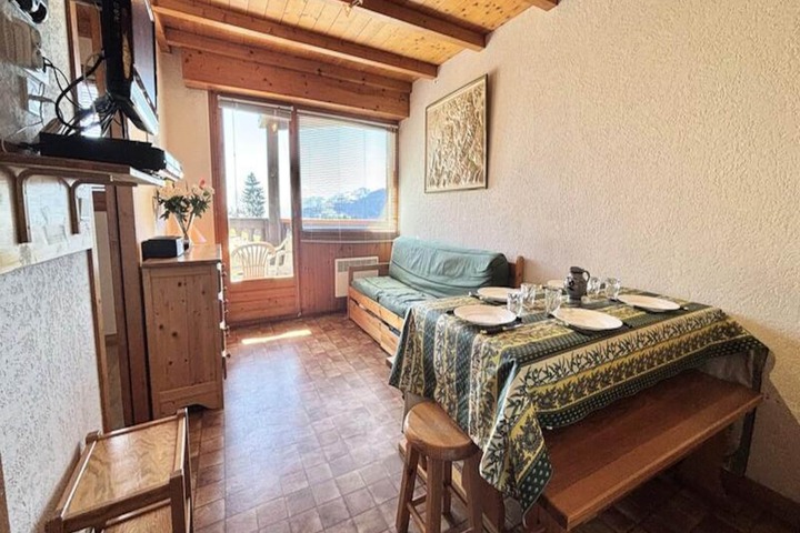 At the foot of the majestic French Alps, this charming ground-floor apartment offers a cozy retreat for your next mountain getaway. Surrounded by serene landscapes and just steps from the slopes, it’s the perfect base for both winter sports enthusiasts and summer adventurers. Wake up to crisp alpine air and enjoy the tranquility of this peaceful location, where the beauty of nature meets the comfort of modern living. Whether you're here for skiing, hiking, or simply unwinding, this residence promises a memorable stay. \n\nThe apartment spans 30 m² and is thoughtfully designed to maximize space and comfort. It features a welcoming living room with a pull-out sofa bed, a kitchenette equipped for preparing hearty meals, a bedroom with a double bed, and a sleeping alcove with two bunk beds. Please note that the upper bunk is not suitable for children under six. A shower room, separate toilet, and a private balcony complete the layout, offering a practical yet inviting space for up to five guests. Additional amenities include a ski locker and a private covered parking space, ensuring convenience throughout your stay. \n\nLocated in a quiet area, the residence provides easy access to the slopes, making it ideal for ski lovers. The nearby toboggan run adds a touch of fun for families, while the surrounding trails invite exploration during the warmer months. For added ease, optional services such as bed linen, towels, and end-of-stay cleaning are available upon request. Pets are welcome for a small fee, allowing you to bring your furry companions along for the adventure. \n\nWhether you’re seeking thrilling alpine activities or peaceful moments in nature, this apartment offers an inviting escape in the heart of the French Alps. Book your stay and create unforgettable memories in this picturesque mountain haven.