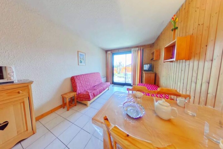 This cozy ground-floor studio is thoughtfully designed to maximize comfort and functionality. The living area features a 140cm sofa bed and a 90cm bench seat, offering flexible sleeping arrangements for up to three guests. The fully equipped kitchenette invites you to prepare hearty meals after a day on the slopes, while the modern shower room and separate toilet add convenience to your stay. With its warm and inviting ambiance, this studio is an ideal base for couples or small families seeking a memorable mountain getaway.