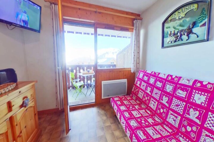 High above the bustling main avenue, this charming two-room apartment offers a cozy retreat with breathtaking views of Mont Bisanne. Bathed in sunlight thanks to its south-facing orientation, the apartment is perfectly positioned for those seeking both tranquility and easy access to the slopes, with the ski lift bridge just steps away. Whether you're planning a winter escape or a summer getaway, this residence promises a memorable alpine experience. \n\nLocated on the first floor of the residence, this thoughtfully designed apartment accommodates up to four guests. The living room features a comfortable double sofa bed, while the separate bedroom is equipped with two 90cm bunk beds (please note the upper bunk is not suitable for children under 6 years). A fully equipped kitchenette allows you to prepare meals with ease, and the bathroom with a separate toilet ensures convenience for all. The south-facing balcony invites you to soak in the serene mountain views, making it an ideal spot for your morning coffee or an evening glass of wine. \n\nThe residence's prime location ensures that everything you need is within reach. From the nearby ski lift bridge providing seamless access to the slopes to the vibrant local amenities, you'll find yourself perfectly situated to explore the region. In winter, enjoy skiing and snowboarding, while summer brings opportunities for hiking, cycling, and discovering the natural beauty of the French Alps. \n\nWhether you're a couple seeking a romantic escape or a small family looking for adventure, this cozy apartment combines comfort, convenience, and stunning scenery to create the perfect alpine retreat.