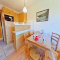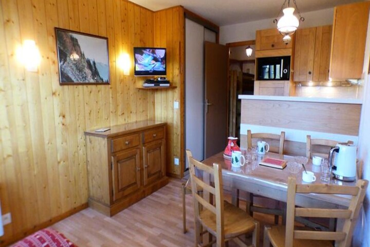Basking in the sunlight of the French Alps, this cozy studio apartment offers a warm retreat just steps from the heart of the resort. With its south-facing balcony overlooking the majestic Mont Bisanne, you’ll wake up to breathtaking alpine views and the promise of adventure right at your doorstep. Whether you’re here for the thrill of the slopes or the serenity of the mountains, this residence ensures a memorable stay in the heart of the Alps. \n\nInside, the apartment is thoughtfully designed to maximize comfort and functionality. The living room features a double sofa bed, perfect for relaxing after a day of skiing or hiking, while the alcove with two single bunk beds provides additional sleeping arrangements. The fully equipped kitchenette invites you to prepare hearty meals, and the modern shower room and separate toilet add convenience to your stay. Please note, the top bunk is not suitable for children under six years old. Rated as a 2-star tourist accommodation, this property combines simplicity with charm, making it an ideal choice for couples or small families.\n\nThe residence boasts a prime ski-in/ski-out location, allowing you to hit the slopes with ease. Nearby, you’ll find a variety of shops, restaurants, and après-ski options to enhance your alpine getaway. In the summer months, the area transforms into a haven for hikers and nature enthusiasts, with trails that lead to stunning vistas and tranquil alpine meadows. \n\nWhether you’re seeking a winter wonderland or a summer escape, this apartment offers the perfect base for exploring the beauty and excitement of the French Alps. Let the charm of Mont Bisanne and the vibrant resort atmosphere create unforgettable memories for your next holiday.