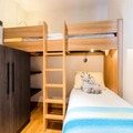 Inside, the apartment exudes sophistication with tasteful decor and high-end amenities. The spacious layout includes a fully equipped kitchen opening onto a cozy living room with a single sofa bed and pull-out bed, perfect for relaxing after a day of adventure. Three comfortable sleeping areas accommodate up to eight guests, including twin beds, bunk beds, and an en-suite master bedroom. Modern conveniences such as a heated laundry room, private heated ski locker, and a south-facing balcony with outdoor furniture ensure every comfort is met.